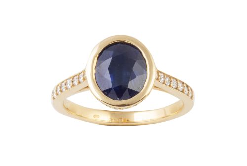 260. Sortija con zafiro oval de 3,17 ct con brillantes en los brazos y base de la montura