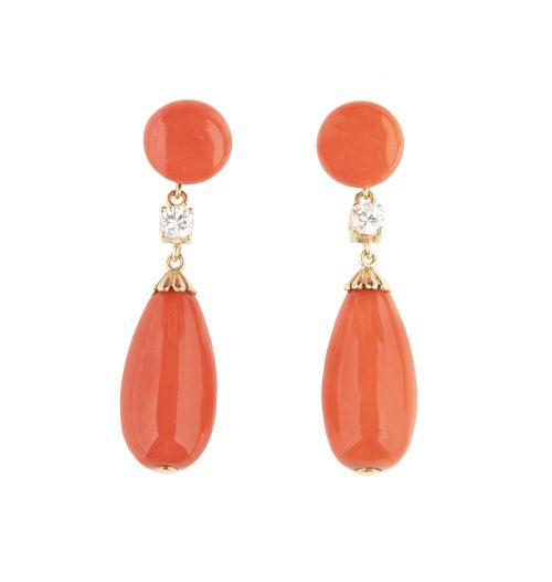 264. Pendientes largos de coral con perillas colgantes de botón superior y brillante intermedio engastado en garras
