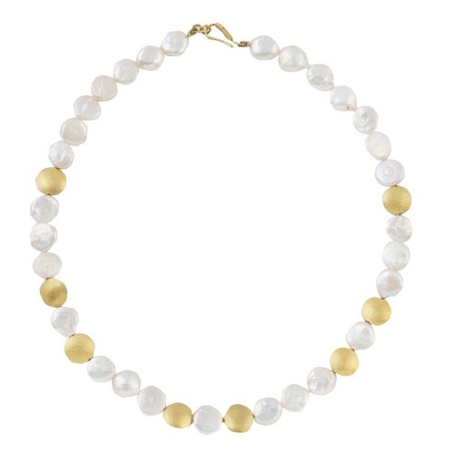 267. Collar de discos circulares de oro y perlas abotonadas planas alternos