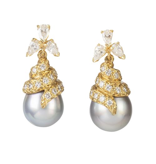 La perla con capuchón espiral de pavé de brillantes, cuelga de trébol de diamantes perilla.