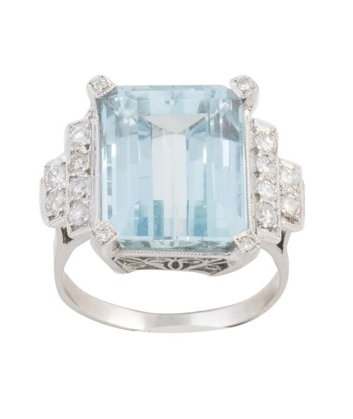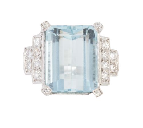 275. Sortija con aguamarina central talla esmeralda flanqueada por bandas escalonadas de brillantes