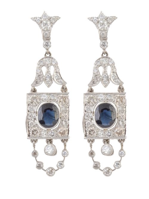 320. Pendientes largos estilo Art-Decó de brillantes y zafiros, con piezas de diferentes formas articuladas