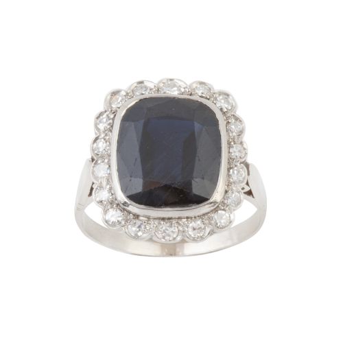 Sortija rectangular con zafiro oval central de 7 ct aprox orlado por brillantes