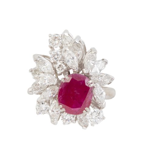 354. Sortija con rubí oval de 2,40 ct y rodeado de brillantes y diamantes navette engastados a diferentes alturas