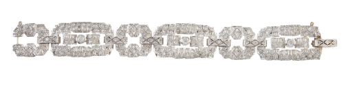 369. Brazalete Art-Decó de brillantes de talla antigua con diseño geométrico, formado por tres motivos rectangulatres calados, articulados con piezas cuadrangulares