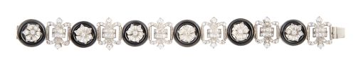 383. Brazalete Art-Decó con seis centros de flor de brillantes sobre botones de ónix articulados con piezas de brillantes a modo de doble flor de lys