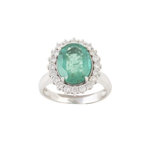 387. Sortija con esmeralda colombiana central de talla oval orlada de brillantes