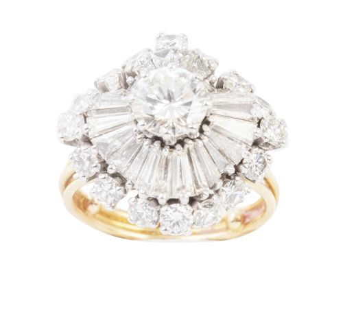 392. Sortija circular con brillante central elevado de 1,15 ct aprox con orla bailarina de diamantes trapecio rematada en orla de brillantes