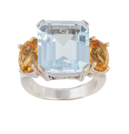 398. Sortija con topacio azul central flanqueado por dos zafiros amarillos de talla oval