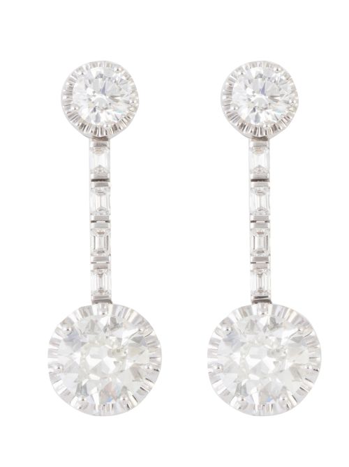Pendientes largos de brillantes, desmontables, con brillantes colgantes que suman 7,5 ct aprox, y que penden de riviere de diamantes baguette y brillantes superiores que suman 2,48 ct aprox.