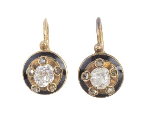 43. Pendientes S. XIX con brillante central de talla antigua y marco exterior de esmalte negro