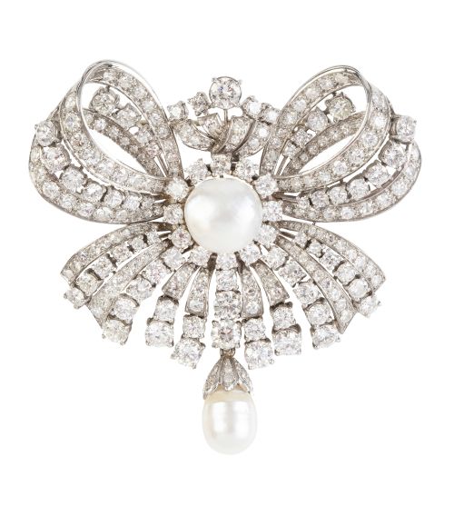Home / SUBASTA MARZO 2025 / Broche lazo años 50 de brillantes con perla abotonada centr