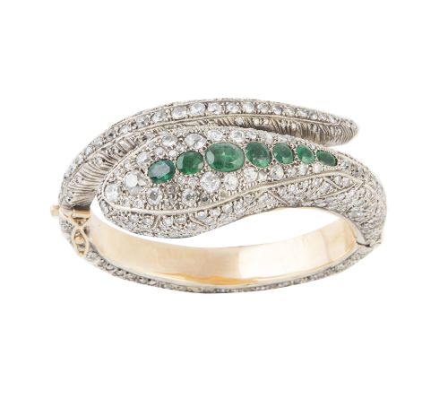Brazalete con diseño de serpiente cuajada de brillantes de talla antigua que suman 18K aprox y esmeraldas que suman 4,5 ct aprox