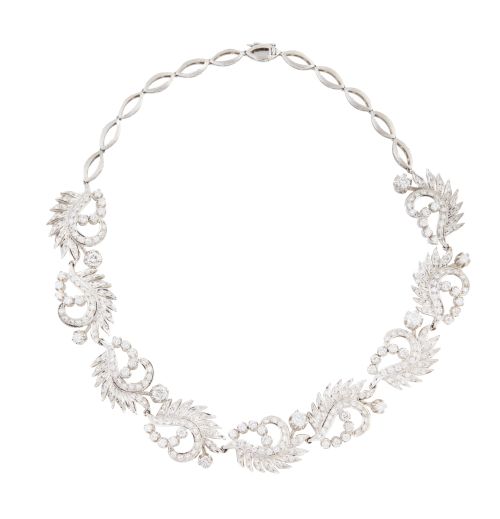 432. Collar años 50 con nueve centros de cintas onduladas decoradas con hojitas de brillantes, y brillantes en garras de mayor tamaño