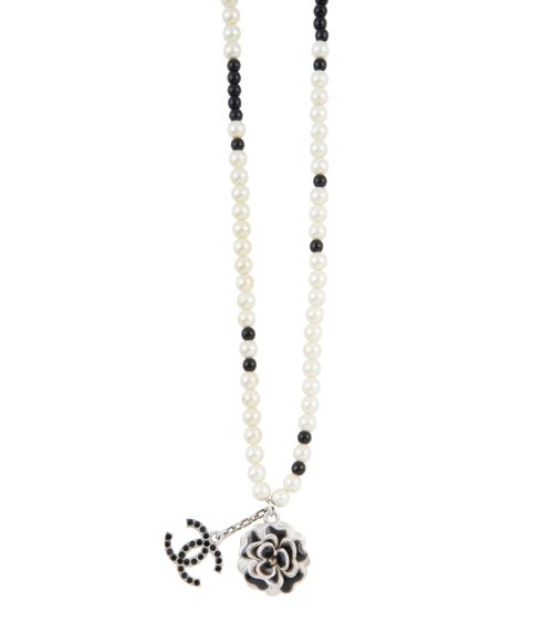 Collar CHANEL de perlas de vidrio y ónix con logo y flor colgantes en metal plateado
