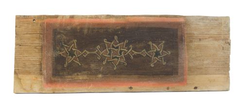 Tabla de madera de pino de artesonado mudéjar con decoración pintada de lacería con estrellas.