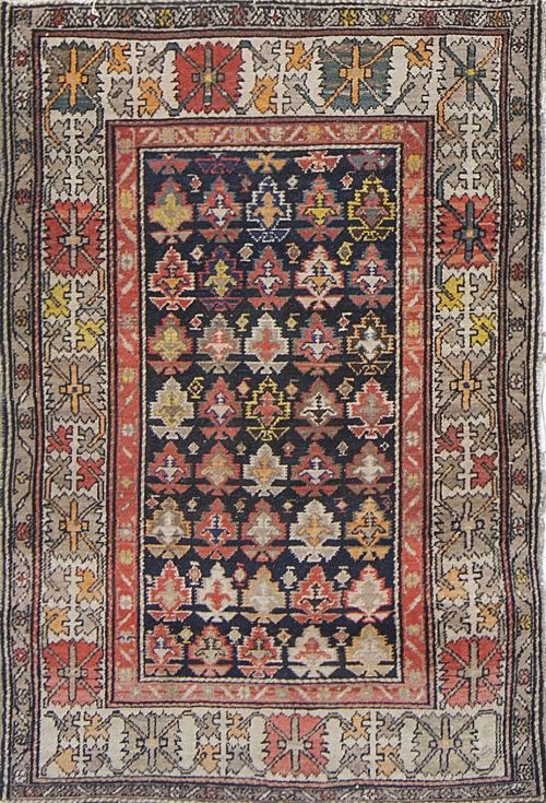 Alfombra en lana con motivos geométricos y campo beige y azul.