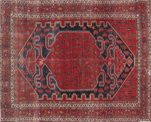 Alfombra en lana de campo rojo y azul, con formas geométricas.