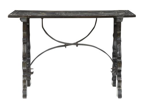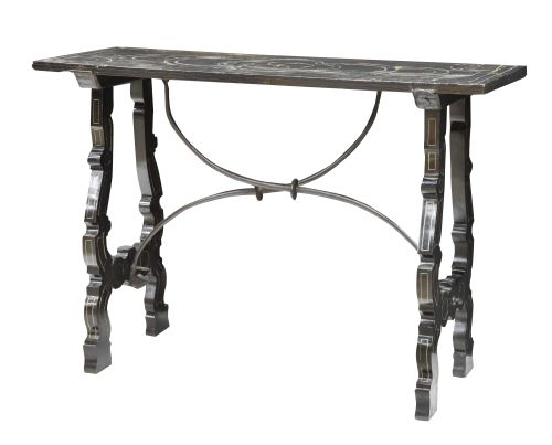 Mesa de madera de ébano con fileteado de metal y fiadores de hierro.