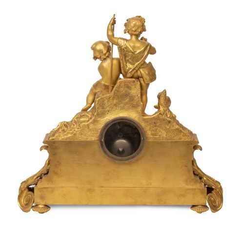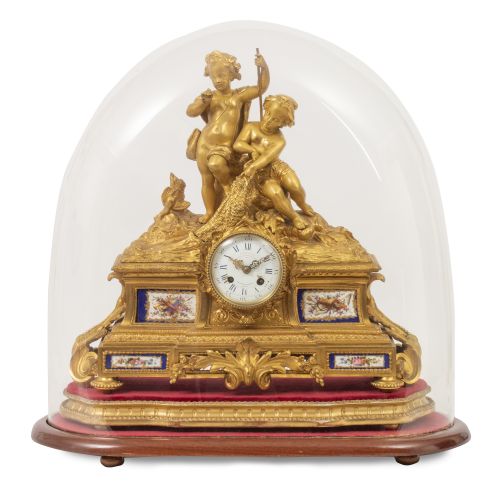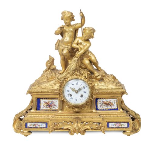 Reloj de sobremesa, Napoleón III, de bronce dorado con dos niños pescando y cartelas de porcelana esmaltada con flores y triunfos, a la manera de Sévres.
