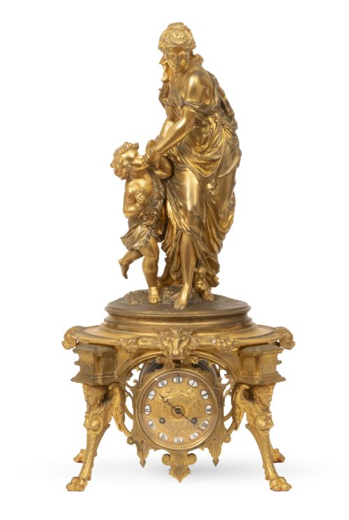 Reloj de bronce dorado con escultura con figura femenina y niño siguiendo el modelo de Pierre-Eugène-Emile Hébert (1828-1893).