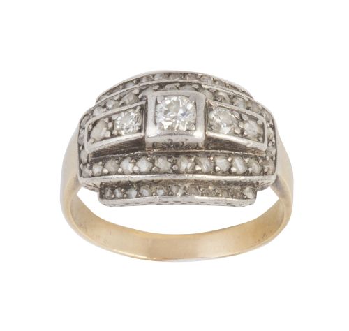72. Sortija Art- Decó portuguesa con banda central de brillantes entre bandas de diamantes