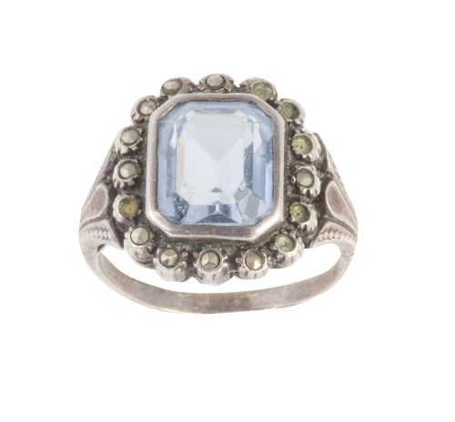 74. Sortija portuguesa de pp. S. XX con piedra azul central de talla rectangular y marco de marcasitas