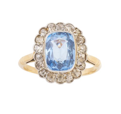 Sortija años 20 con espinela sintética rectangular orlada de diamantes