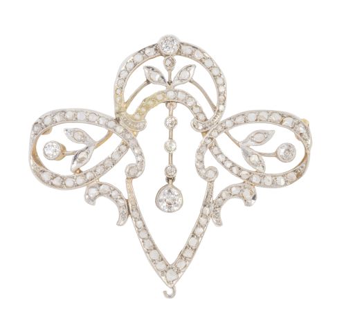 89. Broche Belle-Époque de diamantes y brillantes con diseño de guirnaldas y cintas entrelazadas