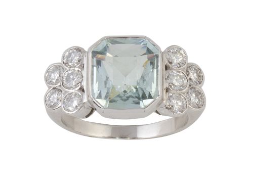 93. Sortija con aguamarina talla esmeralda central flanqueada por cinco chatones de brillantes