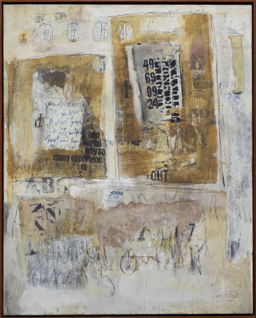 Un magnífico ejemplo de este período neoyorkino es una de las dos obras que presentamos de Sarah Grilo titulada “Learn de facts” de 1965. En esta obra vemos como, sobre un fondo de tonos ocres, se distinguen tres bloques rectangulares que recuerdan unos carteles publicitarios pegados a una pared. Sobre estos y el resto de la superficie del lienzo se superponen toda una serie de grafismos, letras y números que llenan el espacio en aparente desorden, pero con elegancia y sin romper la composición.