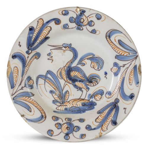 1105. Plato de cerámica esmaltada con una garza y hojas de la serie tricolor.