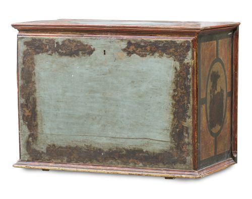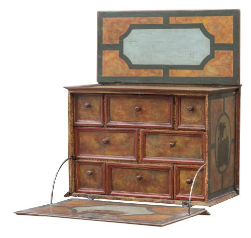 Tapa superior abatible, sobre ocho cajones, en el exterior cenefa decoración de flores y hojas.