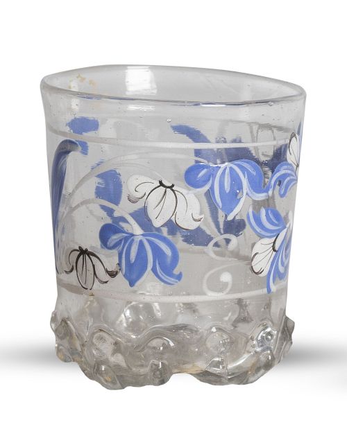 Home / SUBASTA MARZO 2025 / Vaso de vidrio transparente y azul con flores esmaltadas en