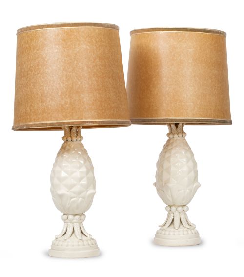 Pareja de lámparas de cerámica esmaltada en blanco, con forma de piña.
