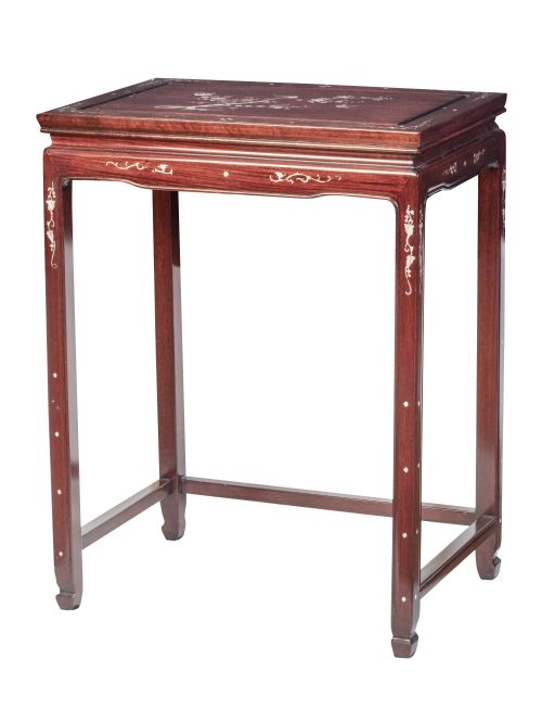 1259. Mesita decorada con hojas de almendro en la tapa y flores.