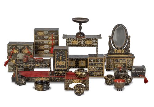 Lote de muebles de madera lacada y dorada para casa de muñecas. Con etiqueta de Far Eastern Antiques