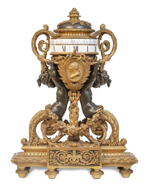 1303. Reloj Napoleón III de estilo Luis XVI, de bronce dorado y pavonado con esfera giratoria.