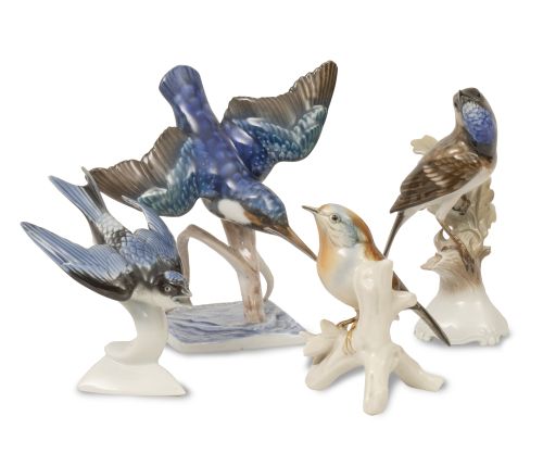 1398. Lote de cuatro pájaros de porcelana esmaltada: uno firmado F. Heidenreich, con marcas de Roshental; otro con marca de Gerold Porzellan Bavaria; otro con marca de Roshental; y otro con marca de Karl Ens, Volkstedt-Rudolstadt, Turingia.