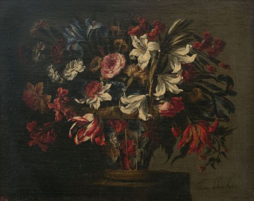 En Cesta de flores sobre un pedestal de piedra, hasta ahora conservada en una colección privada española, el artista presenta una de sus composiciones más características. Sobre un pedestal de piedra, se dispone una cesta rebosante de una rica variedad de flores meticulosamente dispuestas. Entre ellas, destacan azucenas, rosas castellanas y blancas, tulipanes, claveles, anémonas azules y capuchinas, armonizadas en una paleta donde predominan los tonos rojos, blancos y azules. El conjunto se recorta sobre un fondo oscuro, realzando el volumen y la luminosidad de las flores.