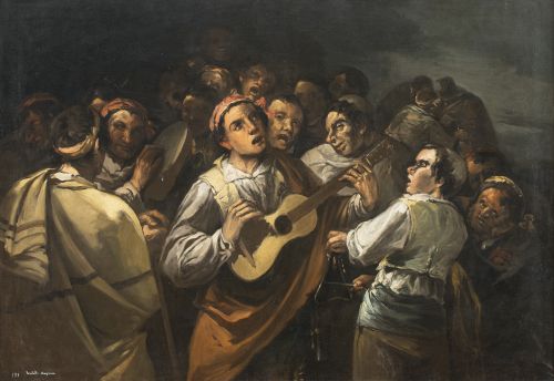El lienzo que presentamos es una vibrante manifestación de la personalidad artística de Lucas. Con una pincelada nerviosa y toques gruesos de color, el pintor captura el instante de una ronda popular perfectamente orquestada, en la que un grupo de personajes humildes protagoniza una animada escena festiva en la calle. Dos músicos tocan la guitarra, mientras otro sostiene una pandereta. Las figuras, pintadas con gran expresionismo y rostros grotescos, reflejan la influencia de los modelos goyescos, ofreciendo una interpretación única de la humanidad popular. Destaca especialmente la figura central del guitarrista, quien, mientras canta, eleva los ojos al cielo, evocando una imagen similar a la del guitarrista en Romería de San Isidro de Goya.