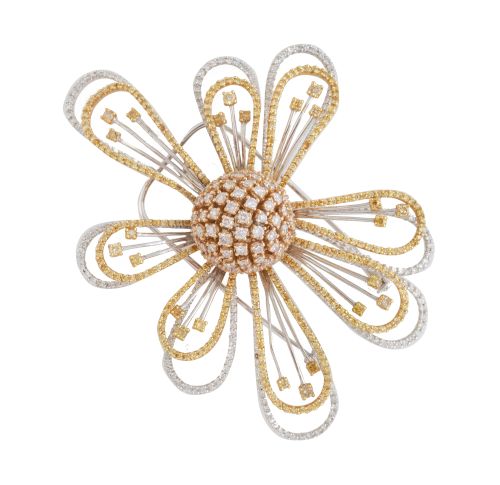 Broche flor de brillantes blancos y yellow en oro tricolor