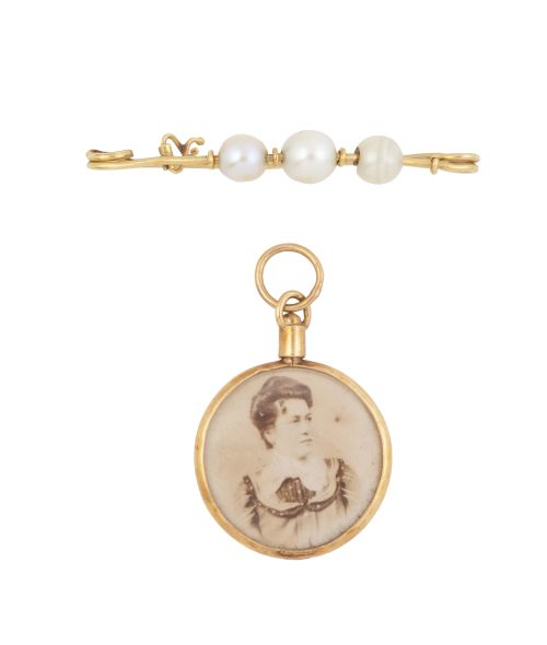 12. Conjunto de broche alfiler con perlas y colgante con retrato de dama