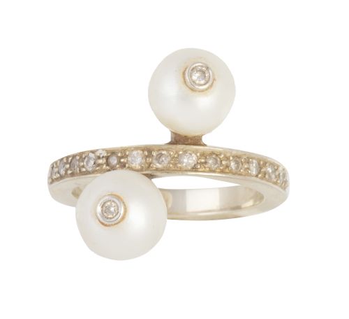 130. Sortija tu y yo con dos perlas coronadas por brillante y brillantes decorando el aro
