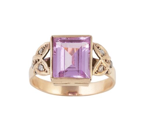 140. Sortija con rosa de Francia rectangular flanqueada por hojitas de diamantes talla rosa