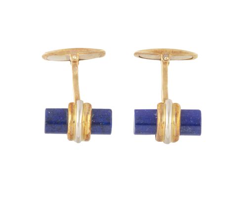 Gemelos cilíndricos con piezas de lapislázuli y gallones en oro bicolor
