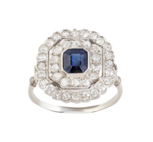 Sortija años 30 con zafiro talla esmeralda en doble marco de brillantes