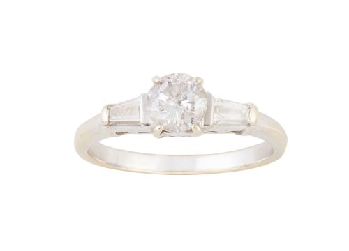 Sortija de brillante central de 0,60 ct aprox flanqueado por diamantes talla trapecio