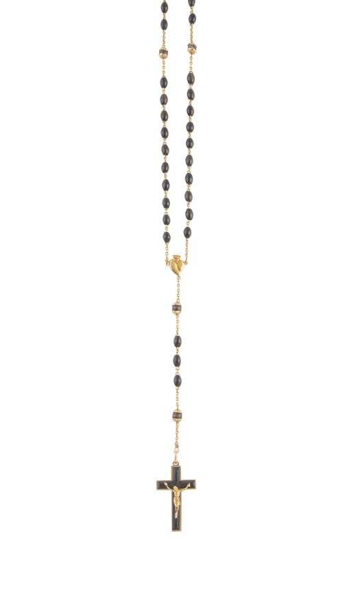Rosario S. XIX de cuentas ovoides de madera y cadena de oro, con sagrado corazón y crucifijo colgante