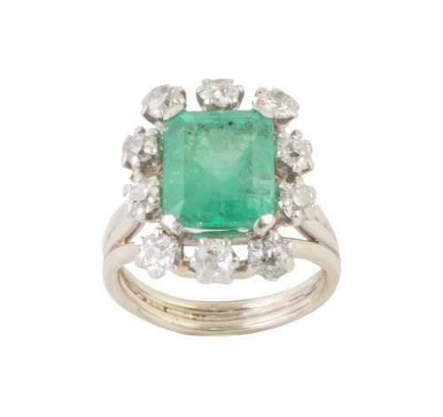 Sortija años 30 con esmeralda colombiana talla esmeralda de 4,50 ct aprox. orlada de brillantes de talla antigua
